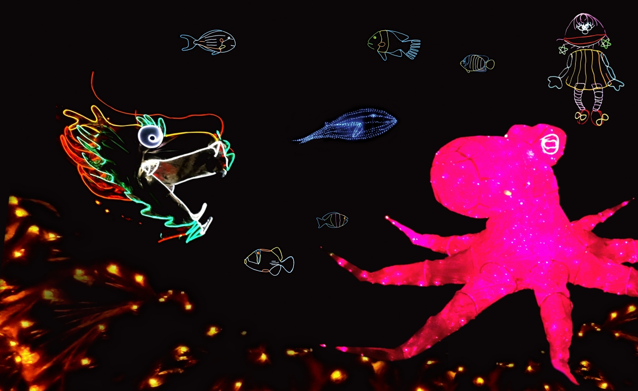 На сцене оживают персонажи: Золотой дракон и Неоновая девочка, стая рыбок и огромный Кит, Малыш размером в 5 метров и гигантский Осьминог!